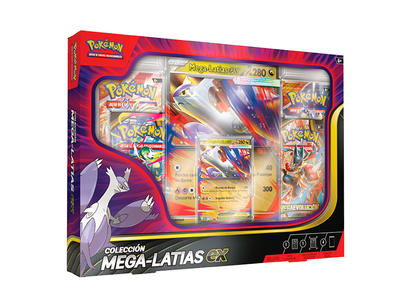 ¡La Megaevolución eleva el poder del Pokémon Legendario Latias más allá de sus propios límites! Gracias a su asombrosa velocidad, Mega-Latias ex surca los cielos con dominio dracónico para aterrizar en tu colección en forma de carta promo holográfica lista para jugar y de carta lenticular jumbo con increíbles ilustraciones. ¡También conseguirás 4 sobres de refuerzo con muchos más Pokémon!